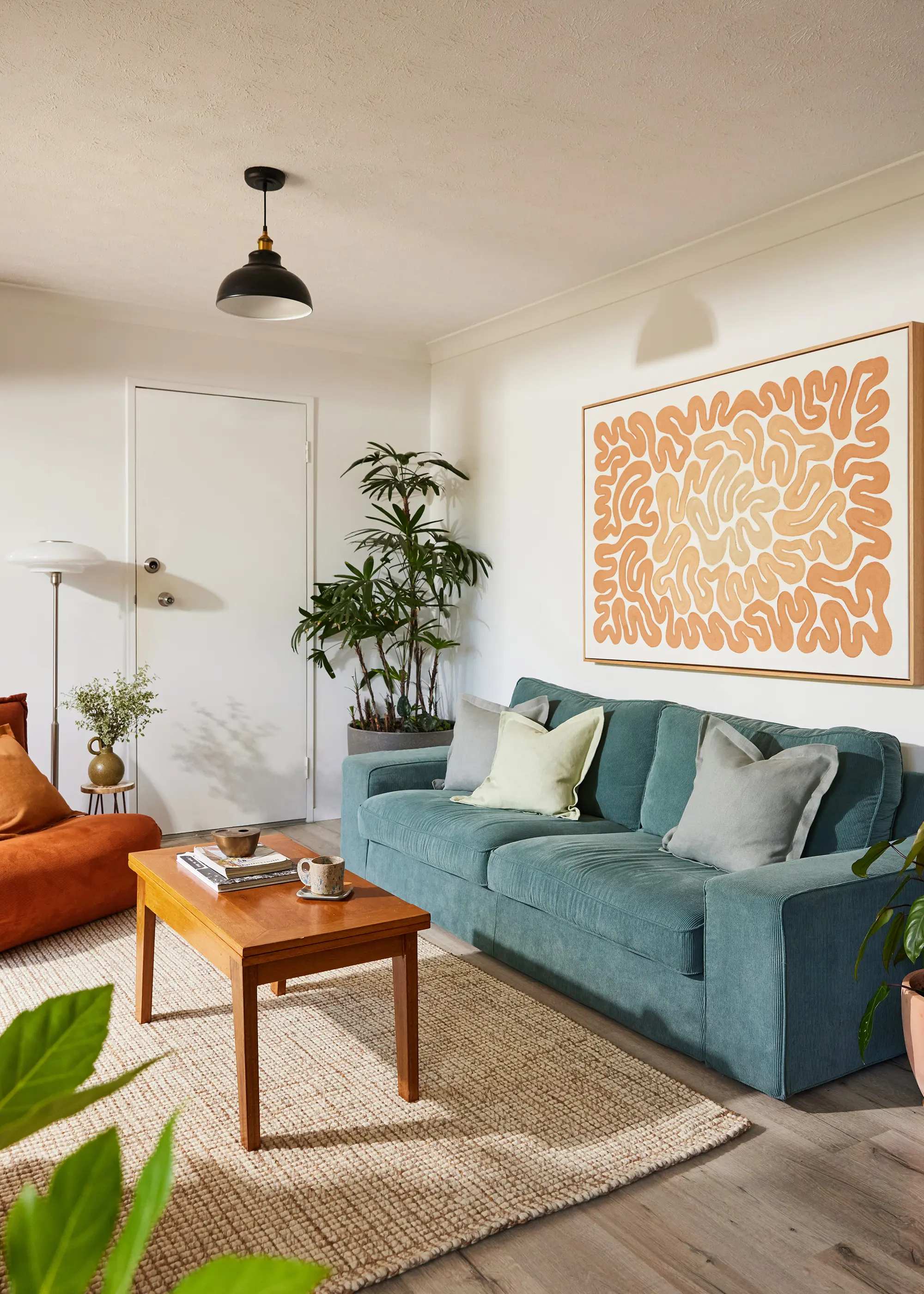 You'll notice the mesmerisingly beautiful ‘Petrichor’ hanging in Adam's sage-toned bedroom and the earthy tones of ‘Dusk’ peppered throughout his apartment – a plant-filled oasis finished with a self-renovated kitchen and vintage furniture. Within walking distance to the bush and the beach, it’s the perfect place to retreat after a long day of creative practice.