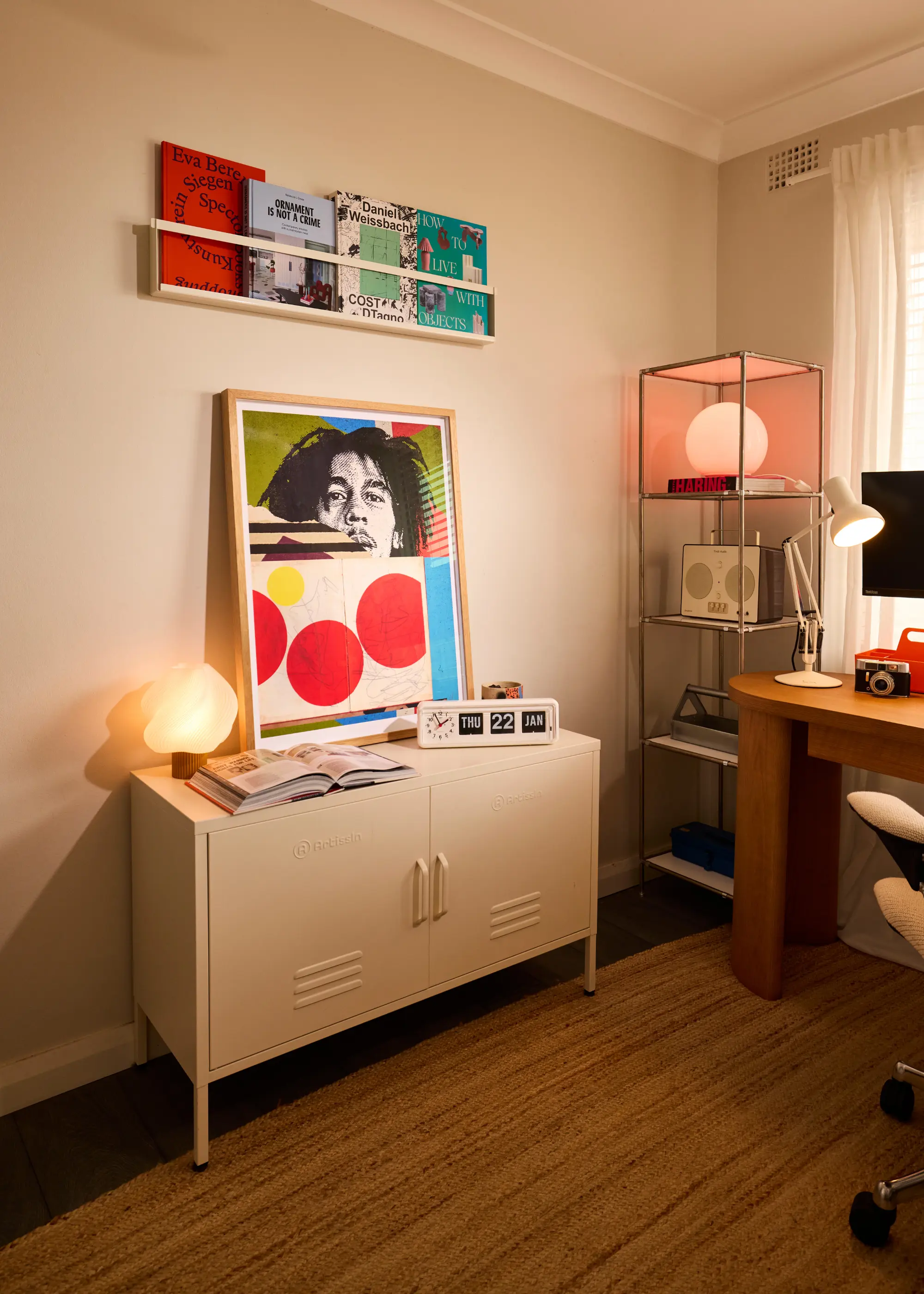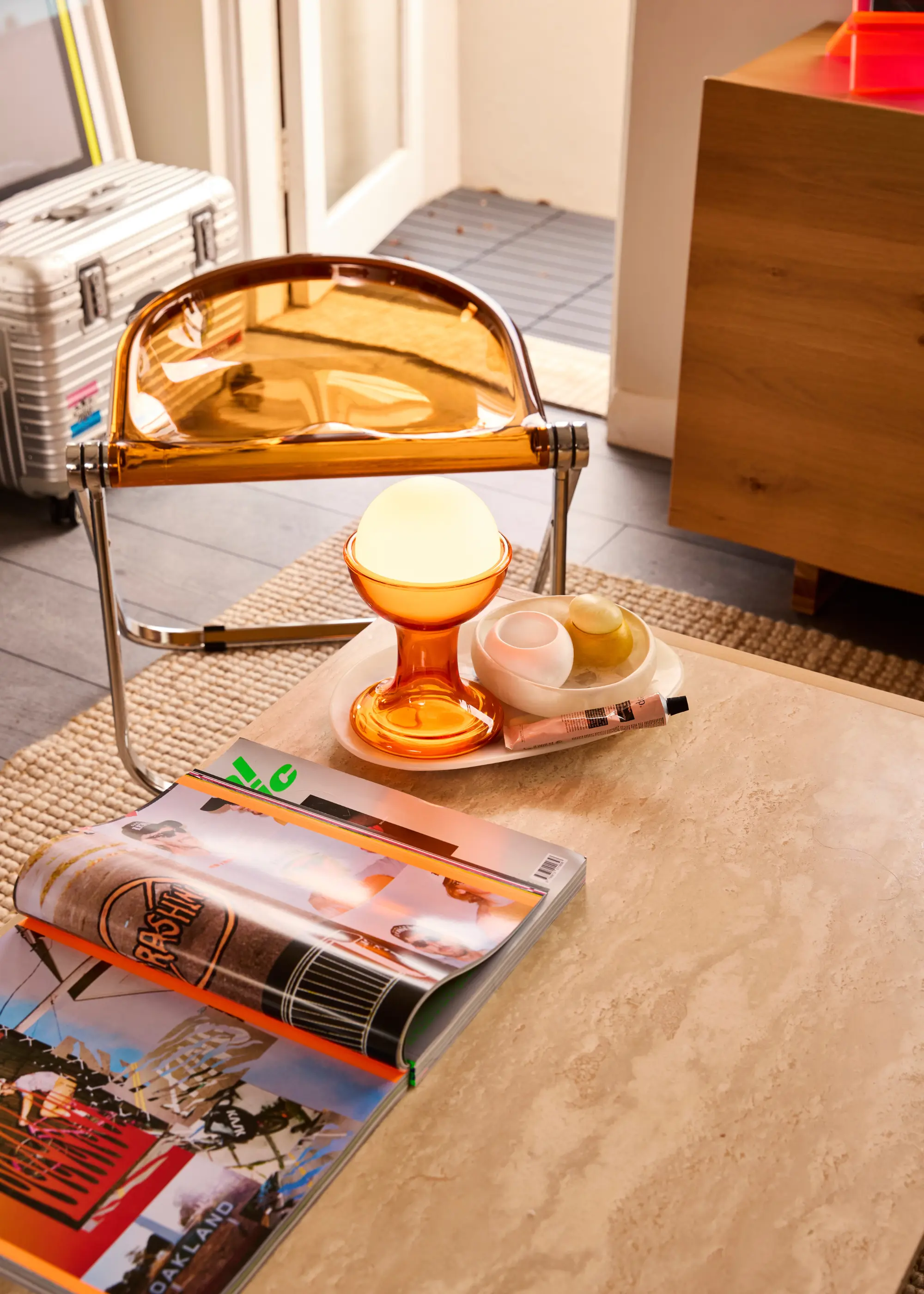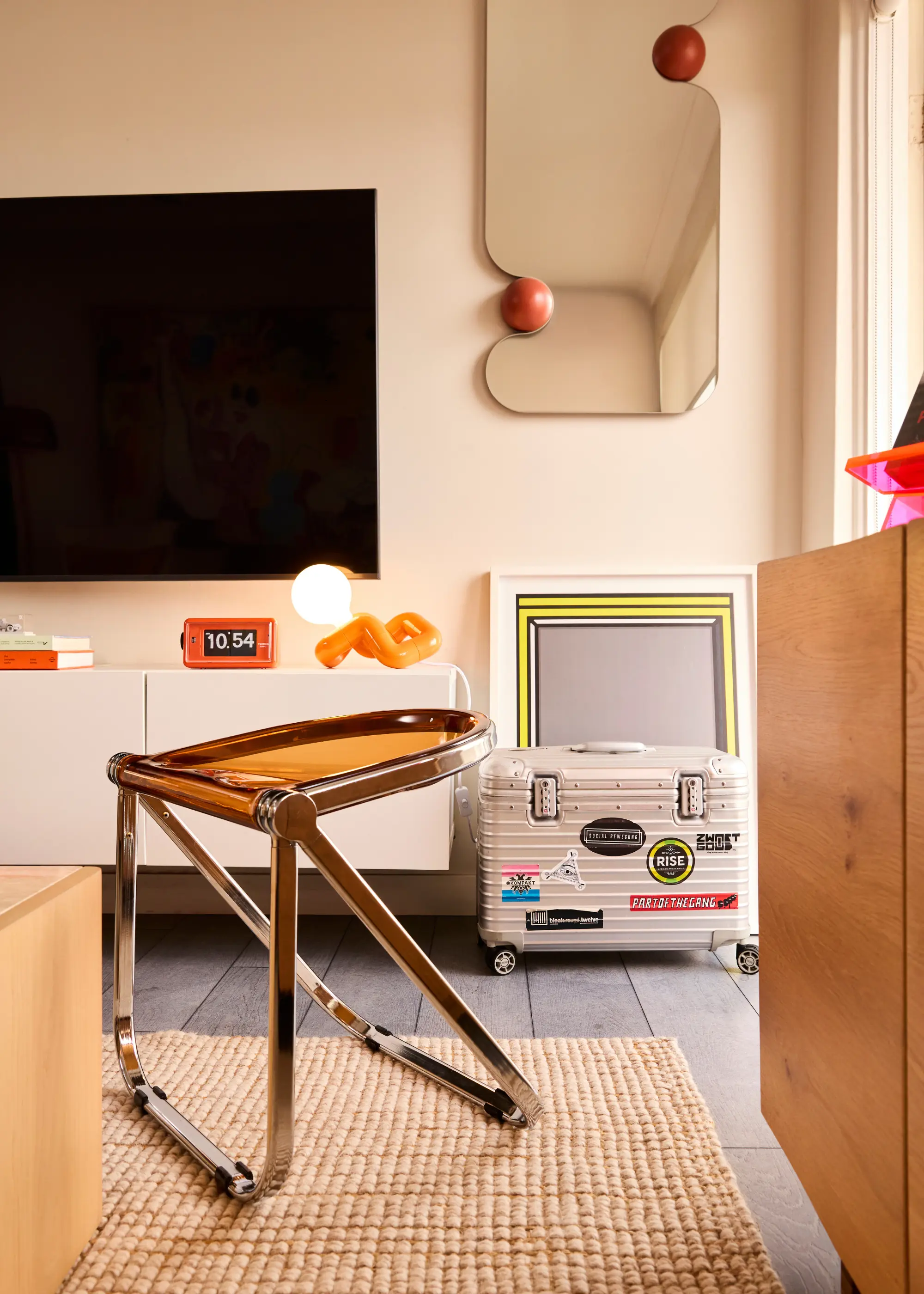 The couple took a considered approach from day one. “We looked through the floorplan, measured everything out and bought pieces that worked exactly within the dimensions of the space,” explains Jermaine – a plan designed to maximise every inch. The next step was grounding the apartment with a core colour: orange. This wasn’t a conscious choice as much as a happy accident. First came their speaker by Orange Amps, then the Evedal lamp by IKEA, fitted with an amber bulb. “It gives that really mid-century feeling without being too over-the-top,” says Jermaine of the base hue.