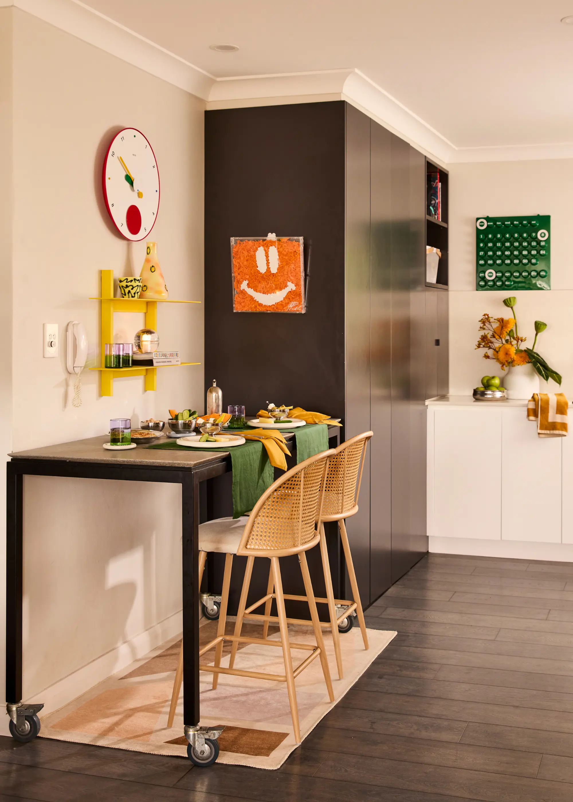 Their apartment – brimming with colour and character – proves that a tight floorplan doesn’t need to stifle creativity. As long as you have an aesthetic vision, a plan and, in this case, someone you trust to take the leap with, you can make something remarkable.