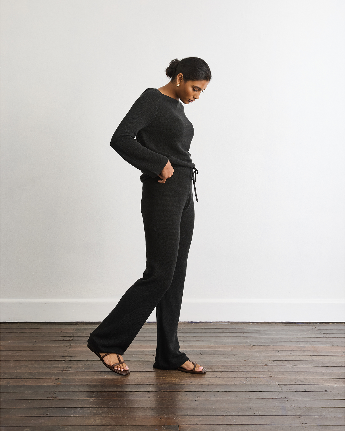 - Linen Knit Pants packaged in a linen storage sack.